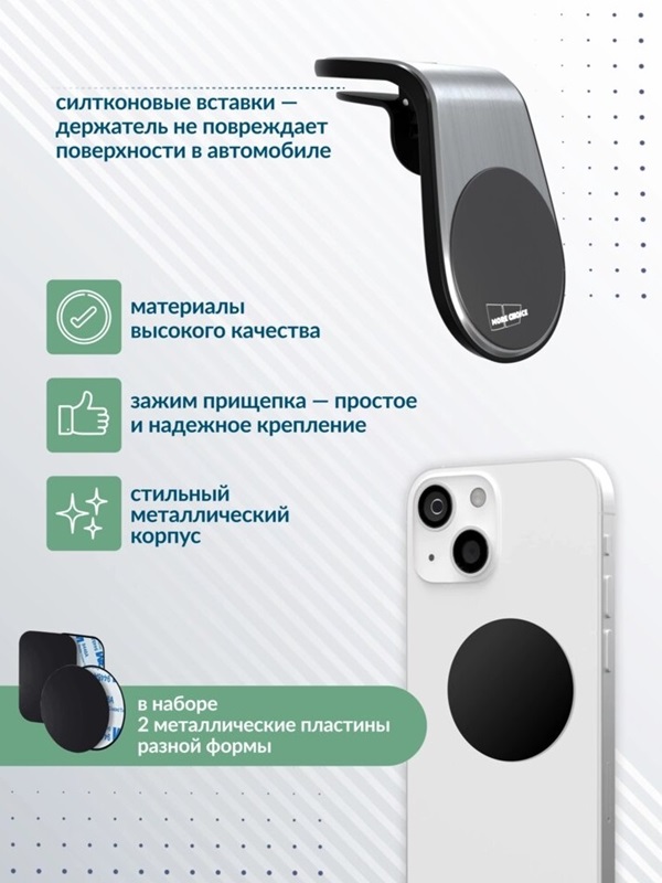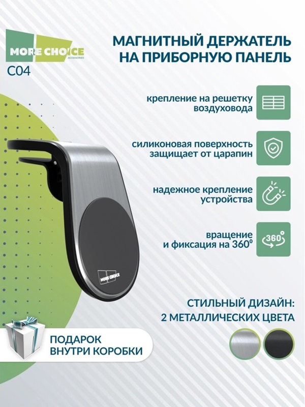 Держатель автомобильный More Choice C04 магнитный, универсальный, серебристый, с табличкой для номера телефона / поворотн