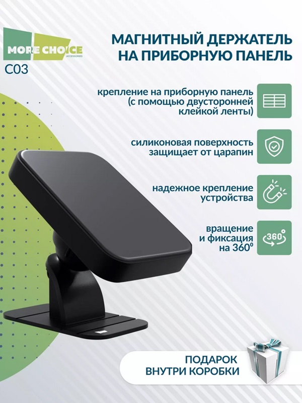 Держатель автомобильный More Choice C03 магнитный, универсальный, черный, с табличкой для номера телефона / поворотный / н