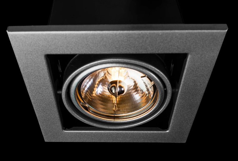 Модель со встраиваемым креплением на потолок имеет поворотный механизм, позволяющий направлять световой поток вниз для точечного освещения.