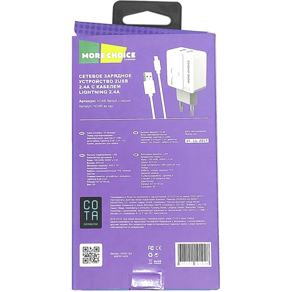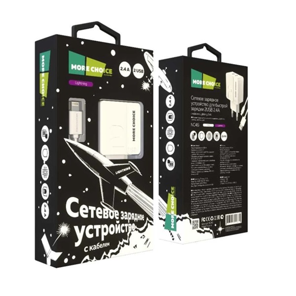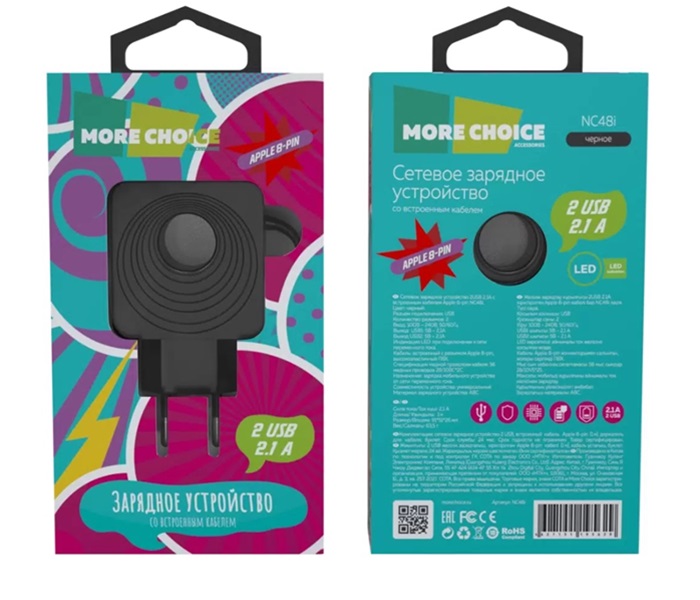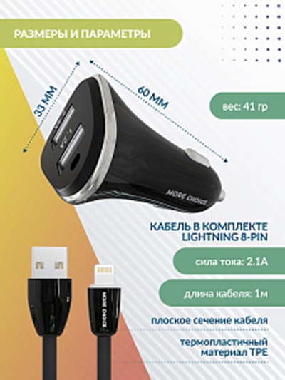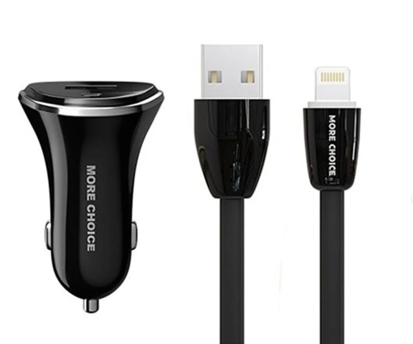 Зарядное устройство автомобильное More Choice AC22i 2USB + кабель USB - Lightning 8-pin, черное, 2.4A / длина кабеля 1м