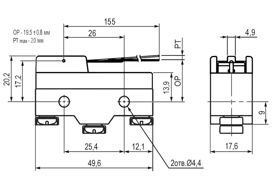 Микропереключатель Z-15GW2-B с лапкой (с роликом), 250В / 15А / ON-(ON), Китай
