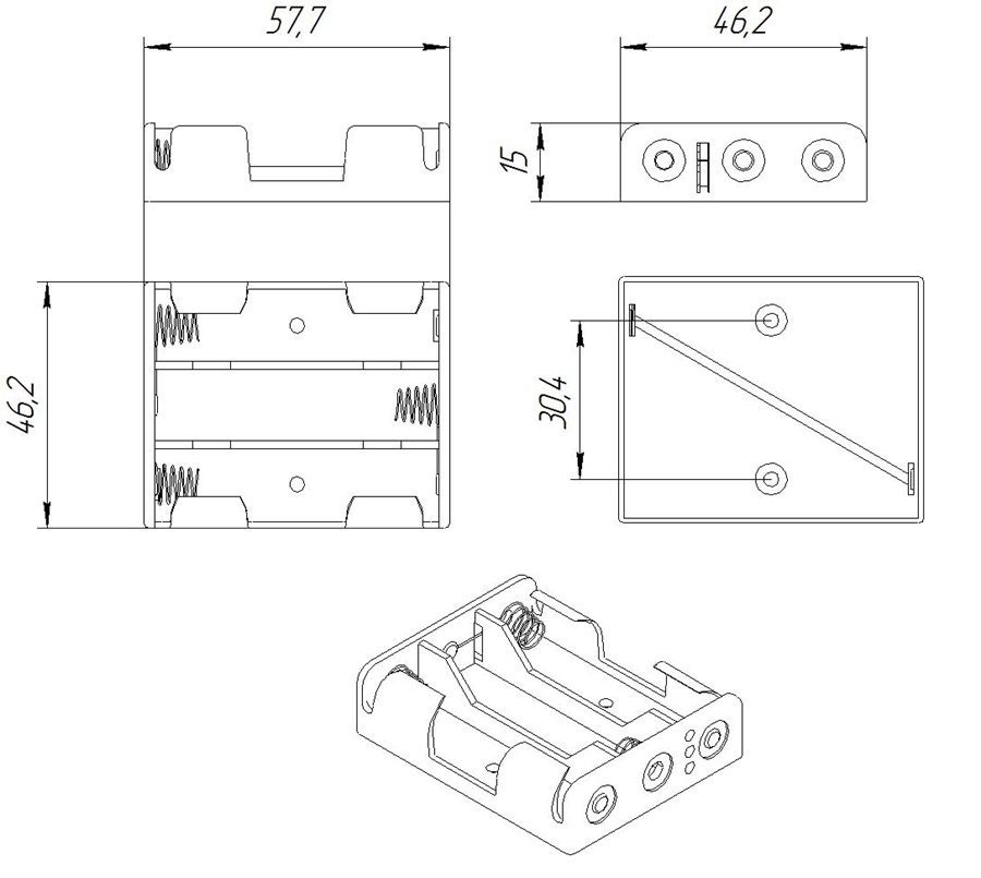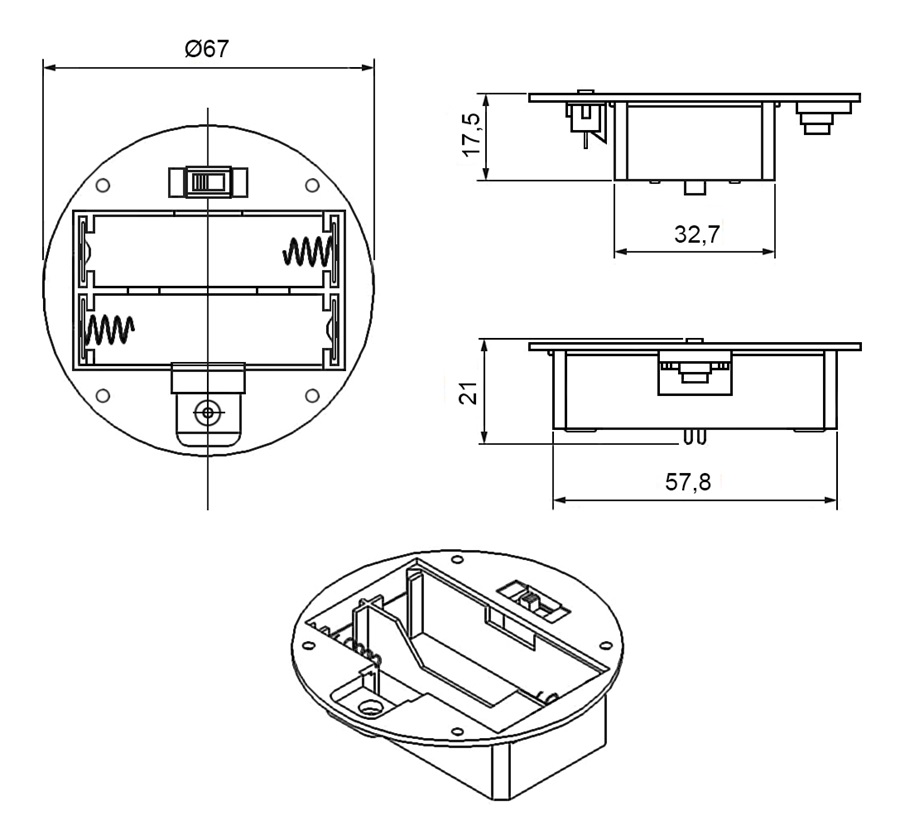 Держатель батарей D67*18mm (2*АА) с выключателем, под пайку, 25…+85 °С, Китай