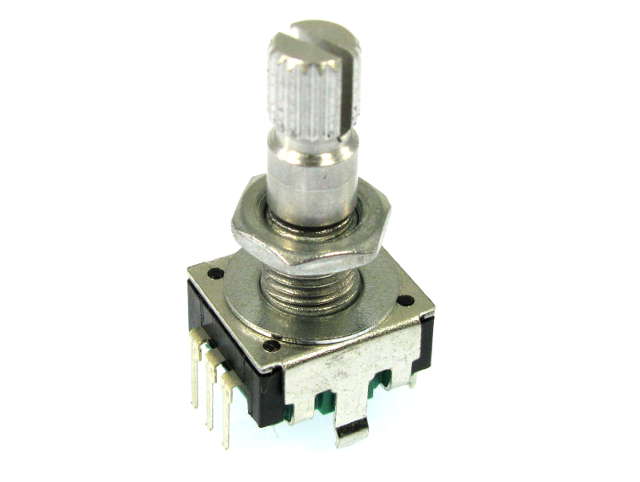 18 щелчков, 18 импульсов, металлический вал с насечкой 20мм, с кнопкой, горизонтальные выводы, крепление на гайку 7мм