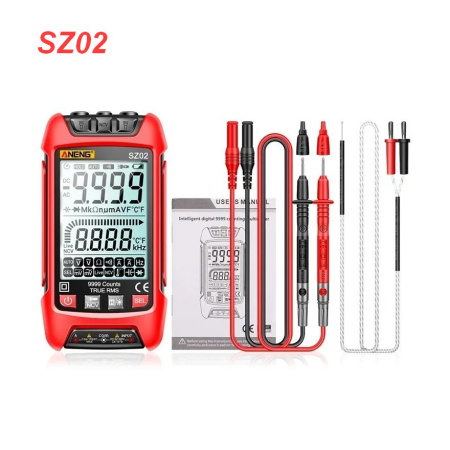LCD дисплей с подсветкой, автоматический выбор диапазонов, удержание данных, индикатор низкого заряда батареи. 9999 отсчетов. Измерение постоянного и переменного напряжения и тока, сопротивления, емкости, частоты. NCV, T-RMS, тест диодов, прозвон цепи, измерение температуры.