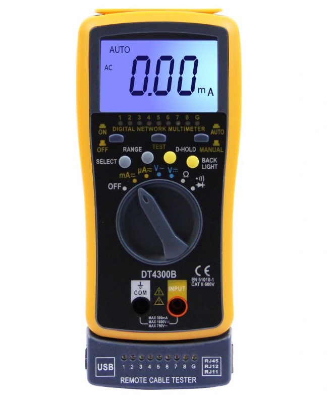 DCV, ACV,DCA,ACA, приставка для проверки кабелей типа RJ11, RJ12 , RJ45, USB. Питание: 1*9V 6F22. Размер: 175x84x40mm. В комплекте защитный бампер и щупы.