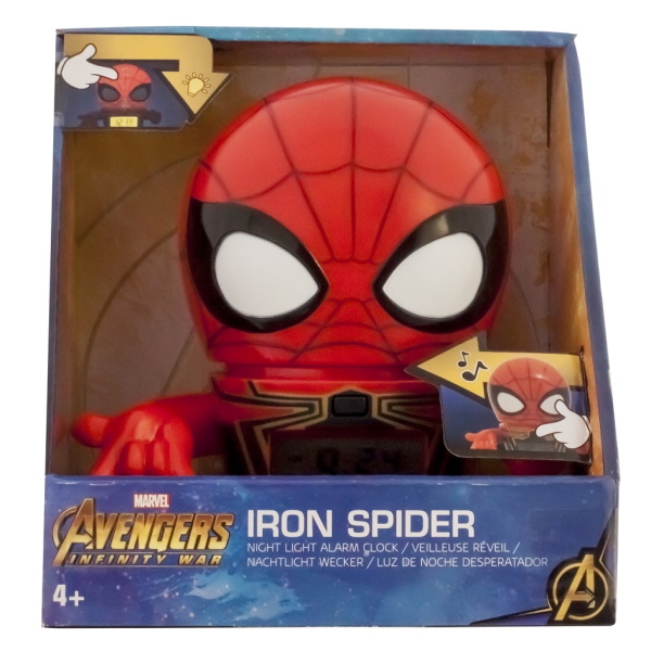 16.5 *15.5*11.5 см. Будильник в виде минифигуры любимого героя «Человек-паук», по форме напоминающий лампу накаливания, оснащен цифровым дисплеем с подсветкой и функцией повтора звукового сигнала.