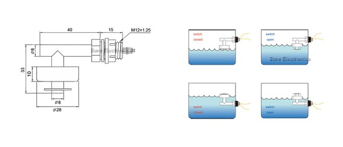 Поплавковый датчик уровня воды 0.5А 100В DC, угловой, max ток переключение 0.5А, max ток нагрузки 1А, max напряжение ком