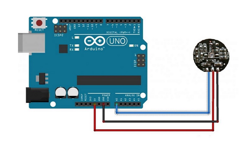 Состоит из двух элементов: мощного светодиода и датчика яркости. Датчик измеряет отражённый кожей свет. Пульсация крови вызывает изменение яркости отражённого кожей света, что и регистрирует датчик. Закрепляется на кончике пальца или мочке уха и подключается прямо к Arduino с помощью нескольких соединительных кабелей.