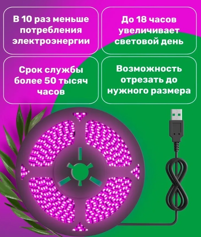 Фитолампа для растений GSMIN B77 (фитолента светодиодная), USB, 5В, 120LED, 2 м , полный спектр / клейкая основа / срок сл