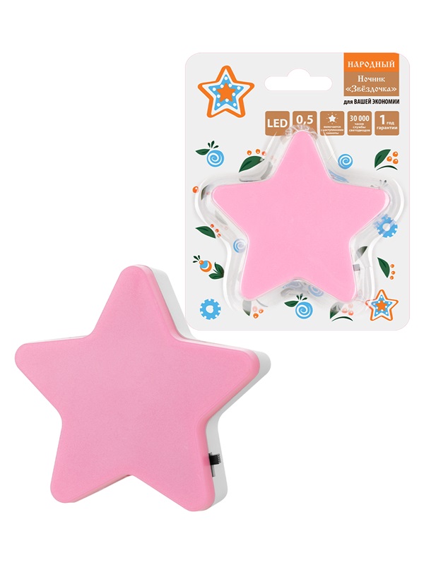 Ночник 'Звездочка' с датчиком освещенности, 0.5 Вт, розовый,220В Народный, SQ0357-0066, TDM