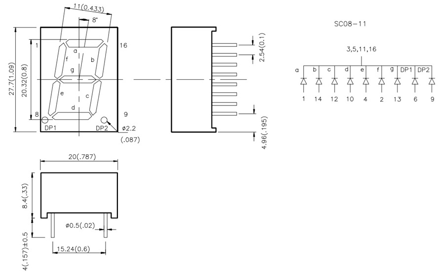 SC08-11SRWA, Одноразрядный цифровой дисплей , Kingbright 20.32mm / single digit numeric display / red / 640nm / 8000-36000ucd