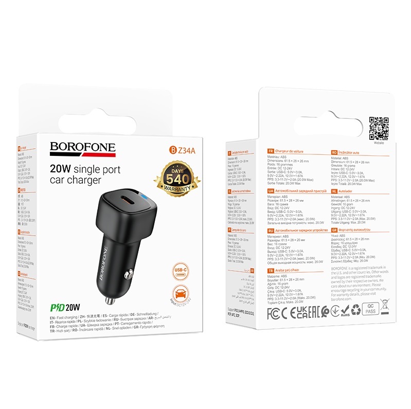 Зарядное устройство автомобильное Borofone BZ34A Cloud USB Type-C, PD, черное, 3А / 20Вт / быстрая зарядка / без кабеля, B