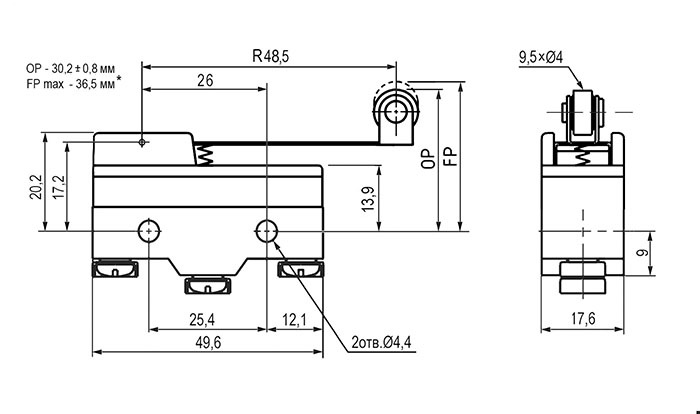 Микропереключатель Z-15GW2-B с лапкой (с роликом), 250В / 15А / ON-(ON), Китай