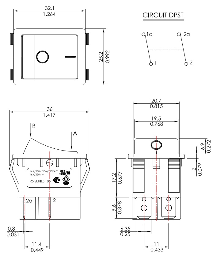SWR YSR-22-22 (L-KLS7-022-102011BB), ON-ON / 19,2* 32мм / 250V / 3A , KLS
