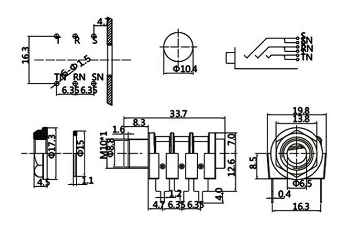 Гнездо TRS 6.3 (JACK) 7-0106 / NP-312, СТЕРЕО, на кабель (SZC-0106), Китай