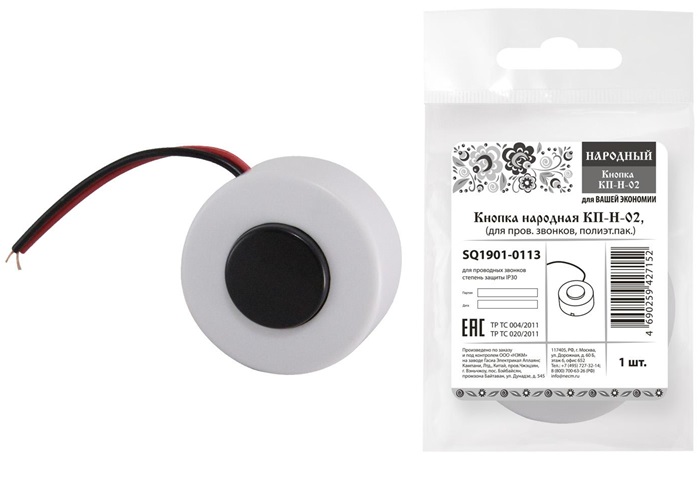 Кнопка народная КП-Н-02 для проводных звонков, (SQ1901-0113) полиэтиленовый пакет, TDM