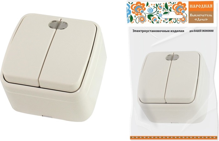 Выключатель 'Дача' 2-клавишный, сл.кость, с подсветкой, открытой установки, IP20, 10А, ( SQ1824-0017), TDM