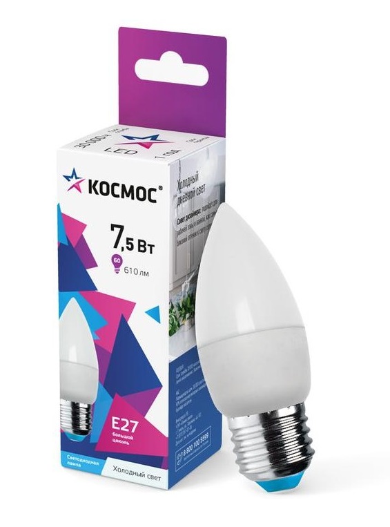 Лампа светодиодная E27 7.5Вт свеча 6500К (холодный белый) 220В КОСМОС, LkecLED7.5wCNE2765