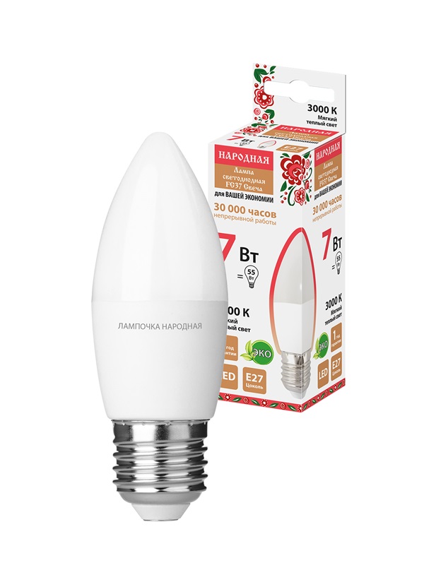 Лампа светодиодная E27 FС37-7 Вт-230 В -3000 К–E27 Народная, белый теплый свет/ E27/ SQ0340-1542, TDM