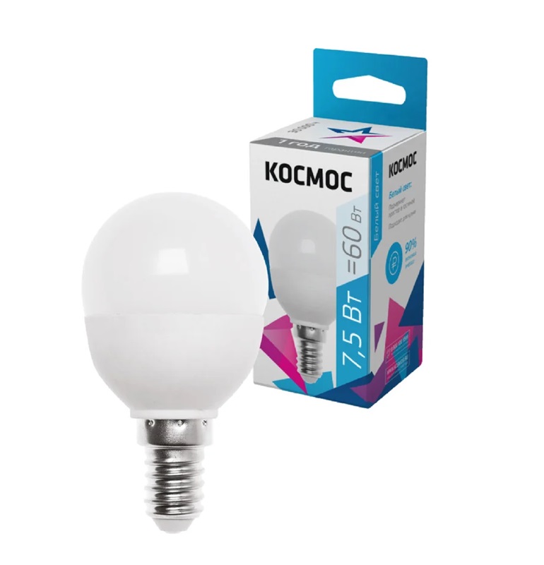 Лампа светодиодная E14 7.5Вт шар 4500К (нейтральный белый) 220В КОСМОС, 45*82мм/ матовая/ LED7.5wGL45E1445