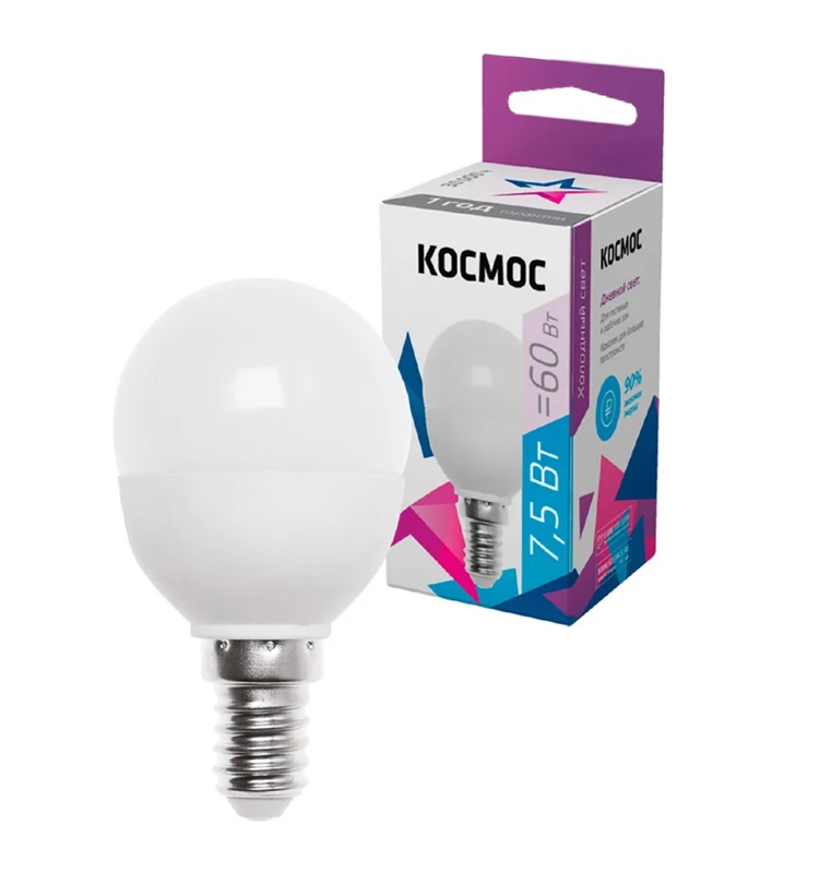 Лампа светодиодная E14 7.5Вт шар 6500К (холодный белый) 220В КОСМОС, 45*82мм/ матовая/ LED7.5wGL45E1465