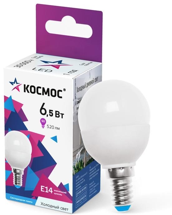 Лампа светодиодная E14 6.5Вт шар 6500К (холодный белый) 220В КОСМОС, 45*79мм/ матовая/ LED6.5wGL45E1465
