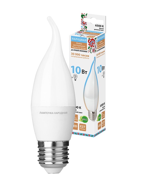 Лампа светодиодная E27 WFC37-10 Вт-230 В -6500 К–E27 (свеча на ветру) Народная, белый холодный свет/ E27/ SQ0340-1603, TDM