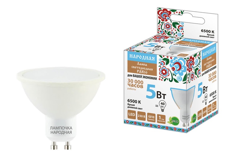 Лампа светодиодная GU10 PAR16 5 Вт, 230 В, 6500 К, Народная, холодный белый /