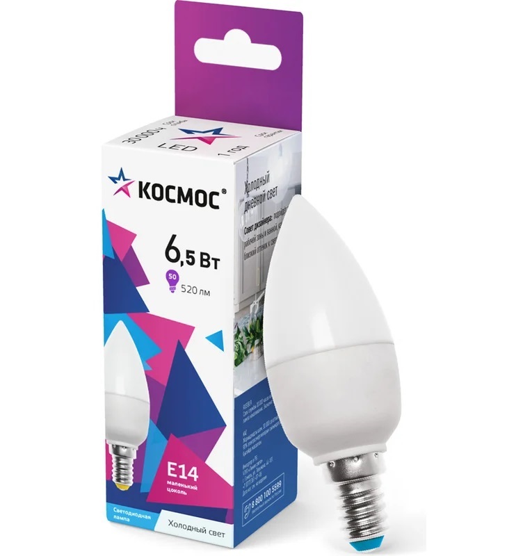 Лампа светодиодная E14 6.5Вт свеча 6500К (холодный белый) 220В КОСМОС, 37*100мм/ матовая/ LkecLED6.5wCNE1465