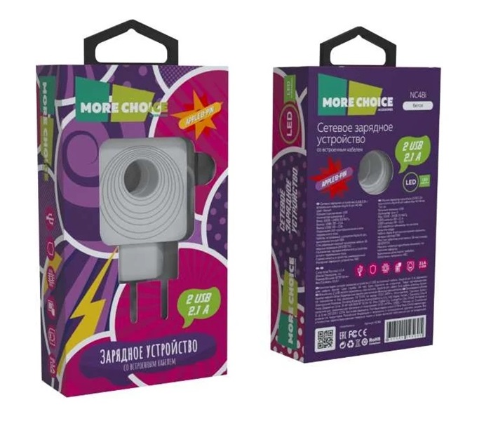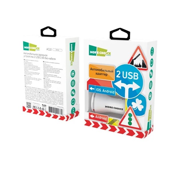 Зарядное устройство автомобильное More Choice AC22 2USB, белое, 2,4А / 12-24В / без кабеля, More Choice Обеспечивает быстр