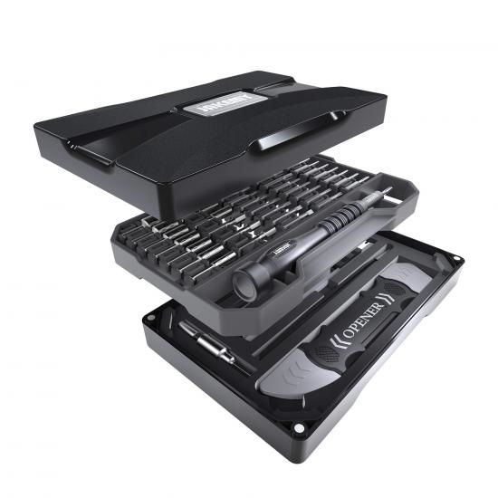 В наборе: головки (M2.5 M3.0 M3.5 M4.0 M4.5 M5.0 M5.5 G3.8 G4.5), биты сталь S2 двойное хромирование, длина рабочей части 12mm размер H4*28mm, удлиненные биты H4*45MM 12mm H4*45MM, аксессуары (пластиковый плунжер 2шт, присоска, пинцет JM T2-11, пластиковые медиаторы 3 шт, гибкий удлинитель 130мм)